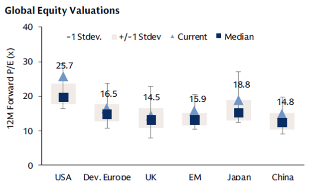 Outlook: The tug-of-war between global economic growth and inflation appears to have reached a more feasible balancing point. Across equity markets, the narrowing of the gulf between growth and value is likely to continue as a greater number of industries start to benefit from higher earnings and improving monetary and fiscal policies. 2025 likely will not be a year of robust economic (GDP growth: U.S. growth is forecast to grow at a modest 1.5%-2.5%, with the Eurozone and Chinese growth lagging. In this environment, investors could benefit from an increased allocation towards value names whilst avoiding an overexposure to growth. Nonetheless, we continue to buy high-quality, profitable, blue-chip equities with strong balance sheets and positive free-cashflow yields. Fixed-income securities also offer attractive yields at these levels, without subjecting portfolios to much downside risk. Emerging market equities and small companies are also available at attractive valuations relative to US Blue Chips. The overall outlook for equities remains cautiously optimistic, supported by a more dovish US Federal Reserve and a resilient US economy, though global risks and sector-specific performance will be closely watched.